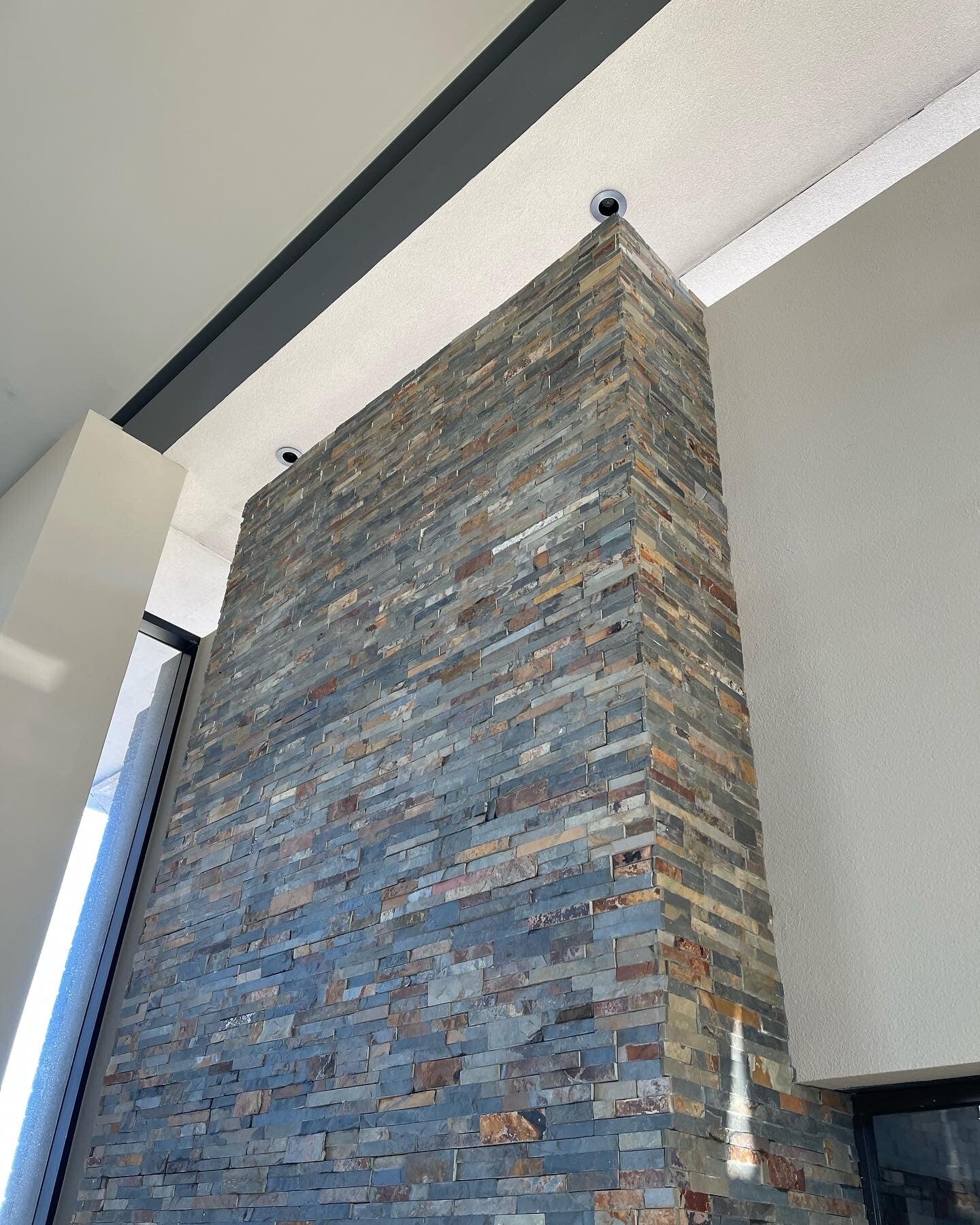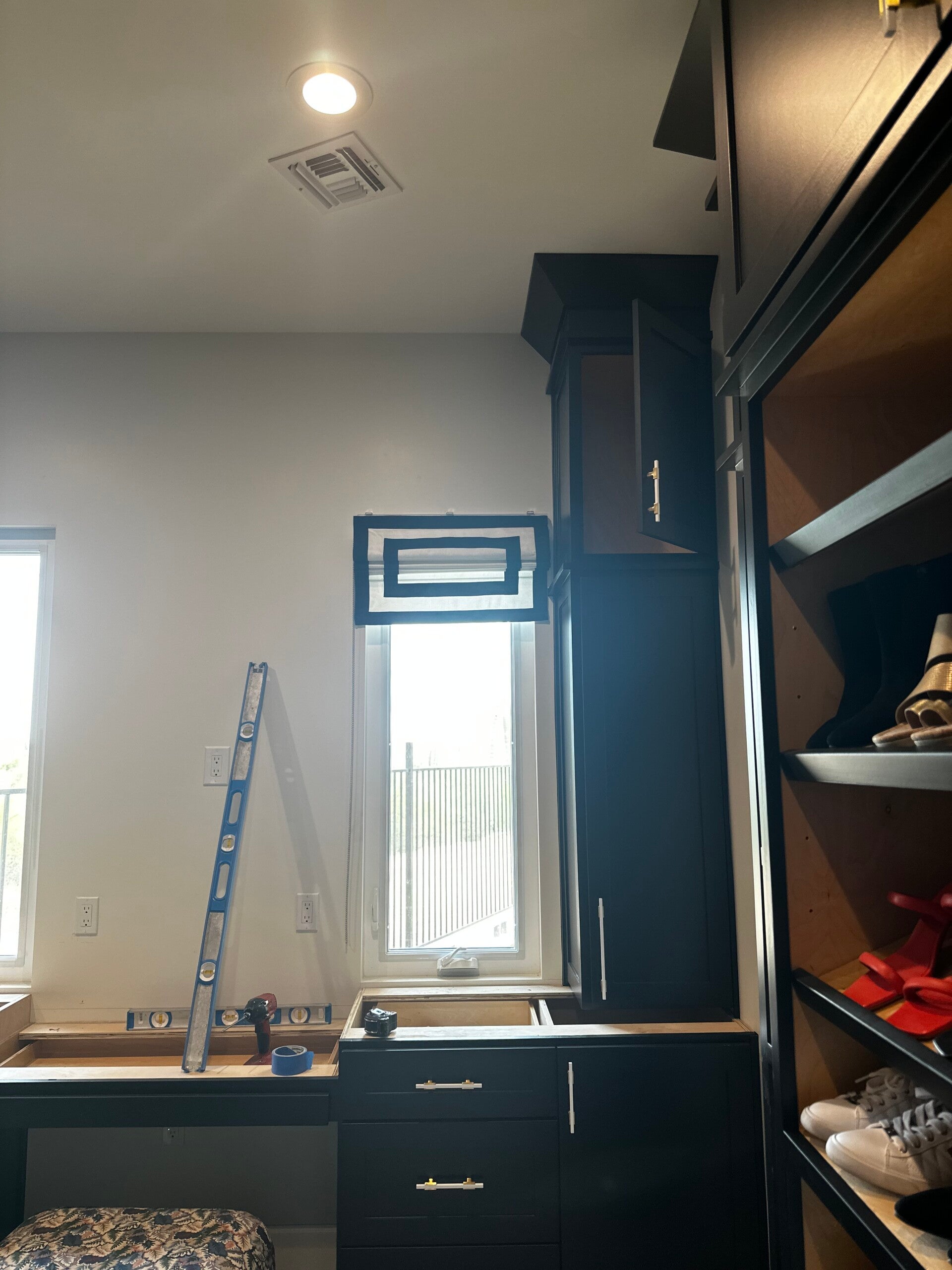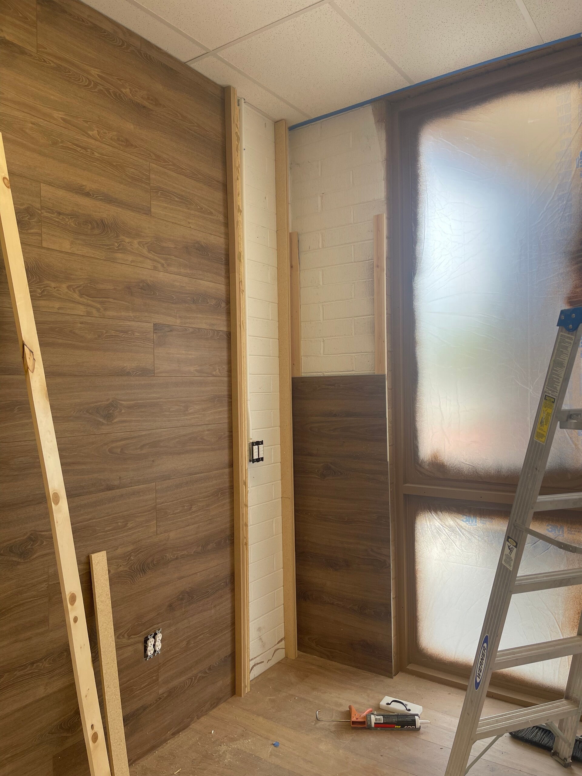 AFTER remodel with two additional closets, hallway, fireplace, slatted wood, flooring and crown to come